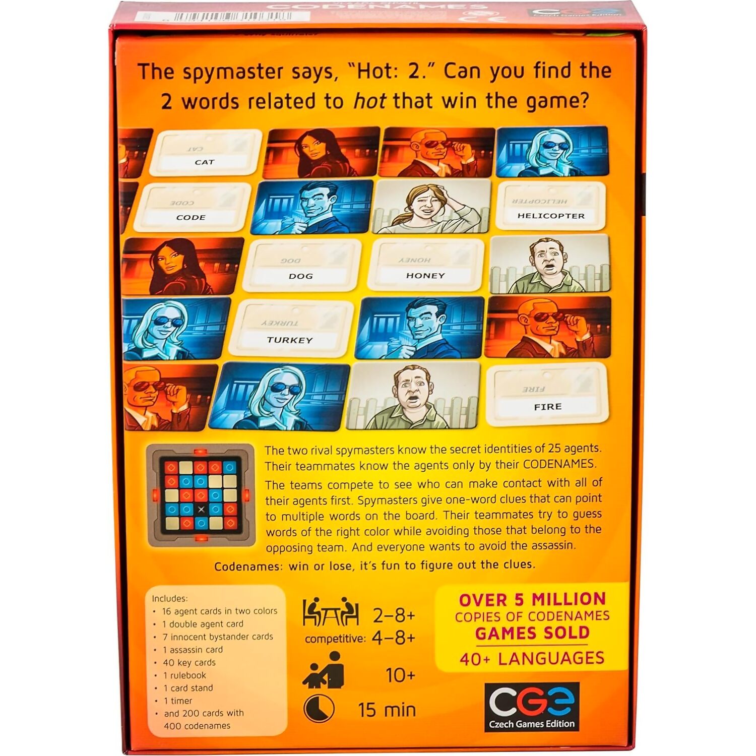 - Contains: 16 agent cards in two colours, 1 double agent card, 7 innocent bystander cards, 1 assassin card, 40 key cards, 1 rulebook, 1 card stand, 1 timer, 200 cards with 400 codenames
