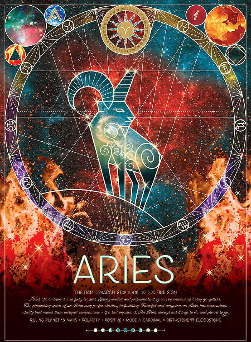 Fire sign. Aries are ambitious and fiery leaders. Strong-willed and passionate, they can be brave and bossy go-getters. The pioneering spirit of an Aries may prefer starting to finishing. Forceful and outgoing, an Aries has tremendous vitality that makes them intrepid companions – if a tad impetuous. An Aries always has things to do and places to go.
