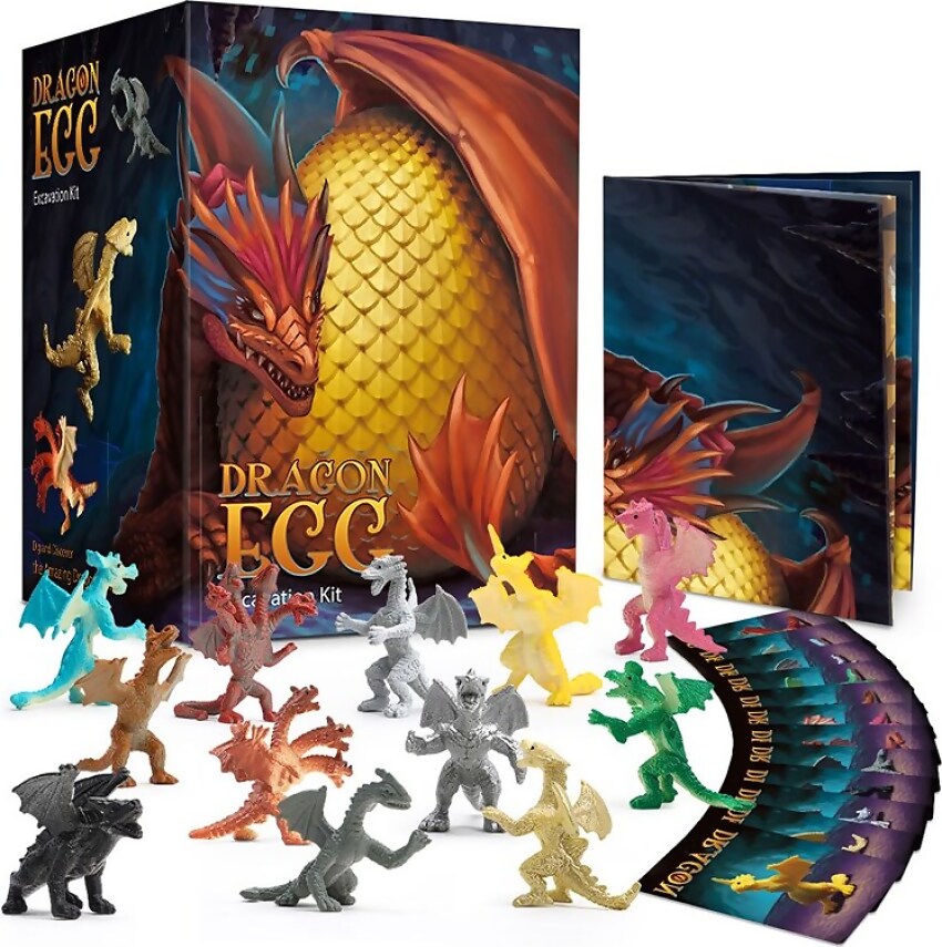Kit includes a golden dragon egg, digging tools, an instruction sheet, 12 dragon information cards and fun, mythical dragons to discover and play with.
