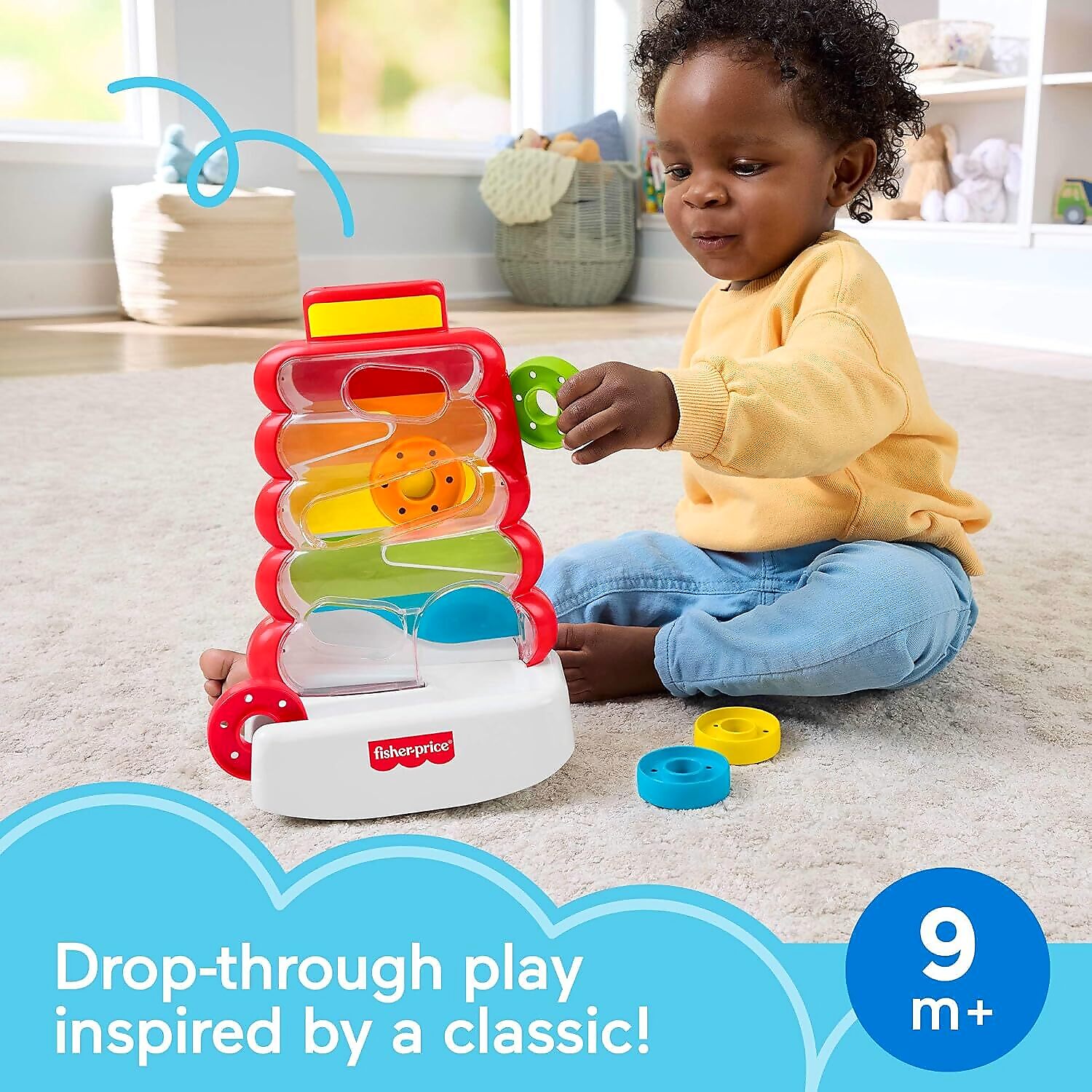 Inspired by the classic Fisher-Price Rock-a-Stack ring stacking toy, this wobbly drop-through activity toy introduces your baby to the fun of cause and effect! The Drop Through Rock-A-Stack comes with 5 colorful rings for little ones to slot through the top or side of the maze and watch as they roll down, around, and out the bottom. For added cause & effect fun, the maze features a wibbly-wobbly base, just like the original Rock-a-Stack toy! Colors and decorations may vary.
