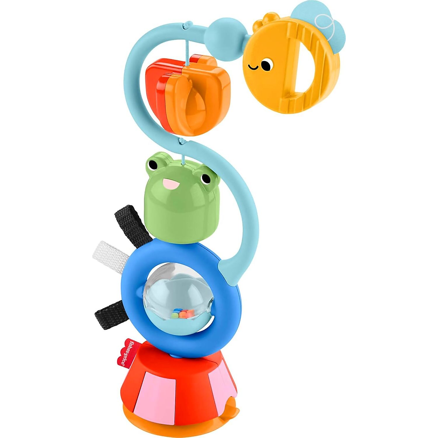 With fun hands-on activities like a jingle flower, clicking bee spinner, chime froggy and rattle rollerball, this suction cup toy helps foster important development including fine motor skills, auditory and tactile senses, and cause and effect. Colors and decorations may vary.
