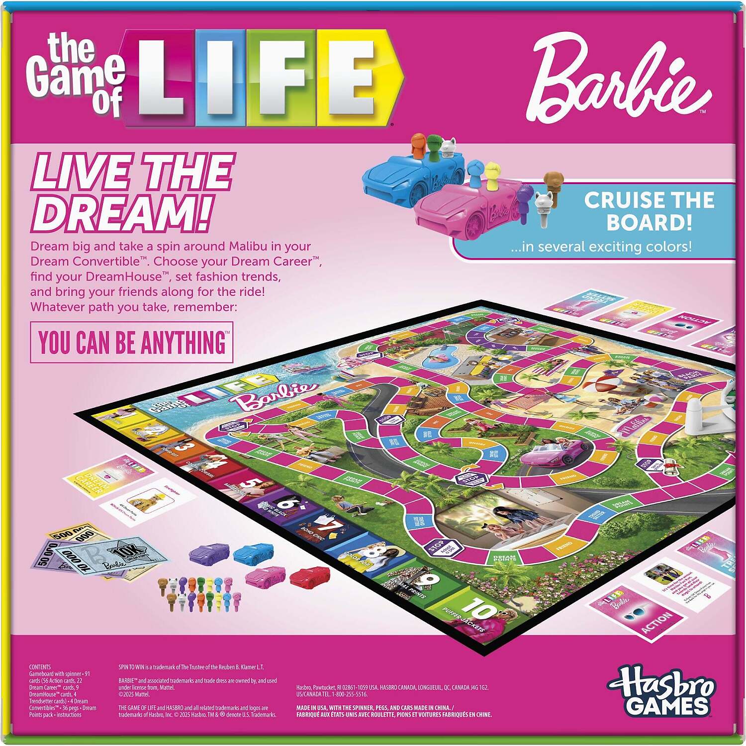 Live the dream with Barbie in The Game of Life Barbie Edition. This fun family board game lets players dream big as they cruise to a Malibu Beach Party in a Dream Convertible.