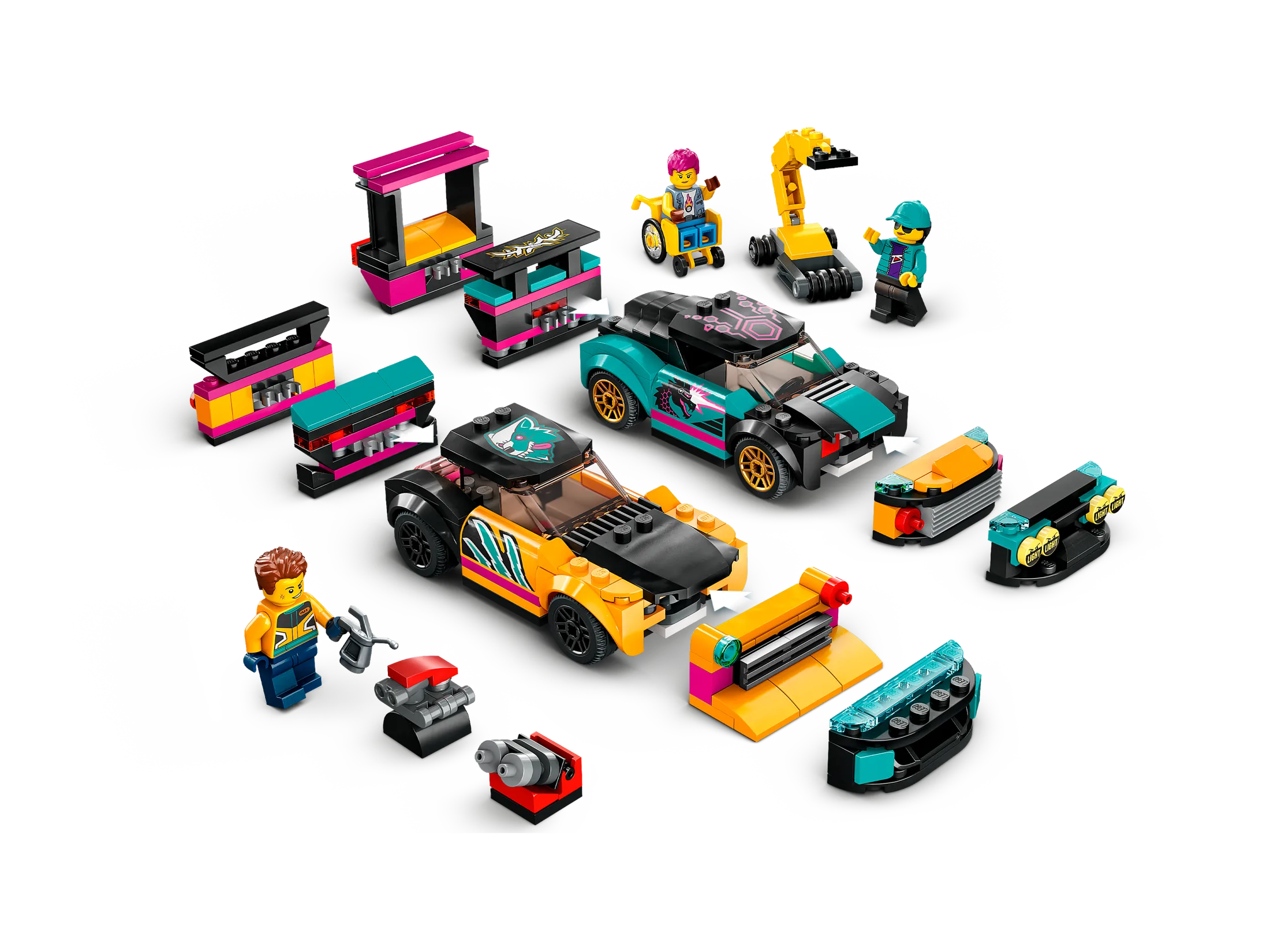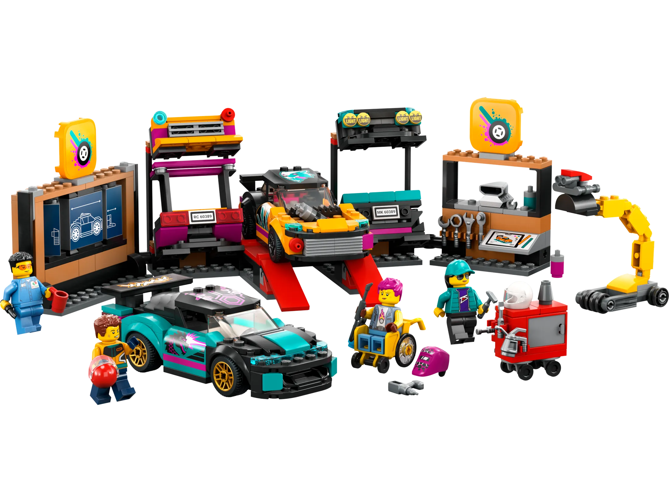 - What’s in the box? – All kids need to create a custom car workshop with a configuration wall, ramps, engine hoist and 2 customizable cars, plus 2 mechanic and 2 driver minifigures