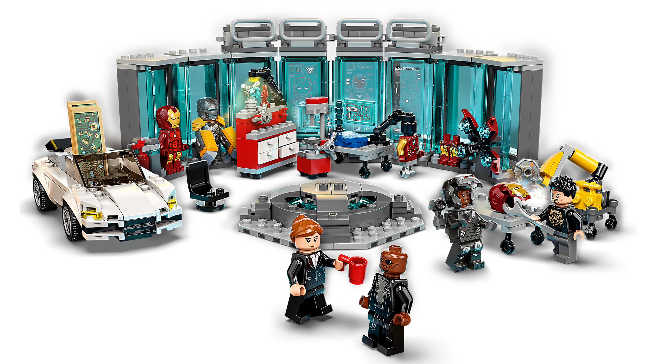 - Realistic details – Familiar items from the movies include a sports car with Stark Expo model-map, a robot assistant arm, a work area with tools and loads of authentic accessories