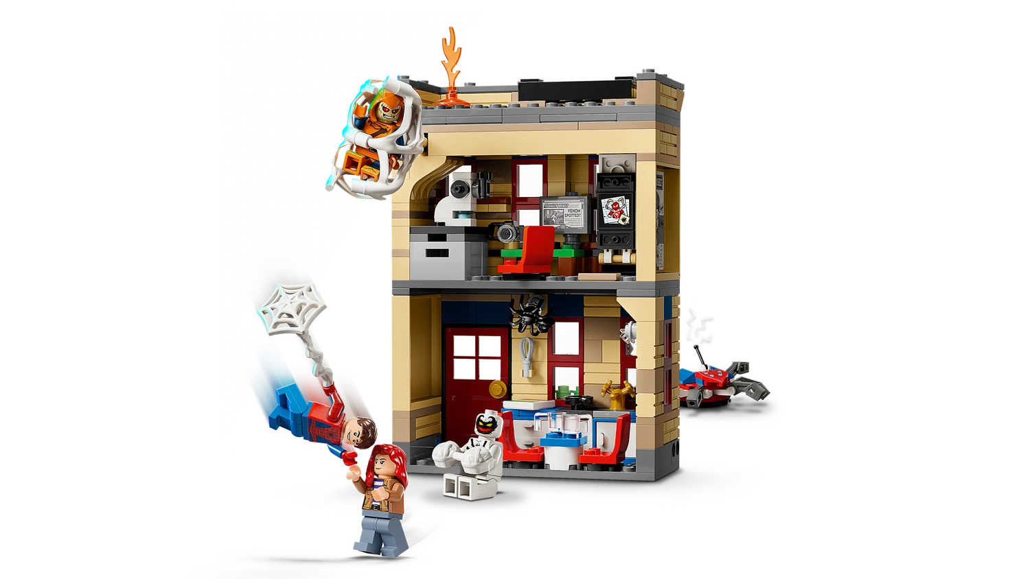 - LEGO® ǀ Marvel Spider-Man accessories – The 2-level apartment contains a kitchen, study and bedroom and features a giant, flexible, minifigure-trapping web attached to the outside of the building