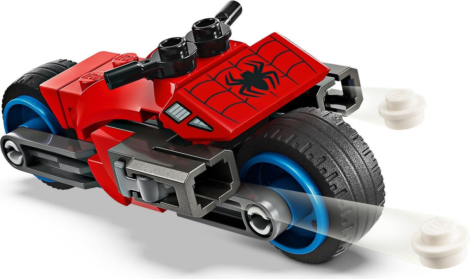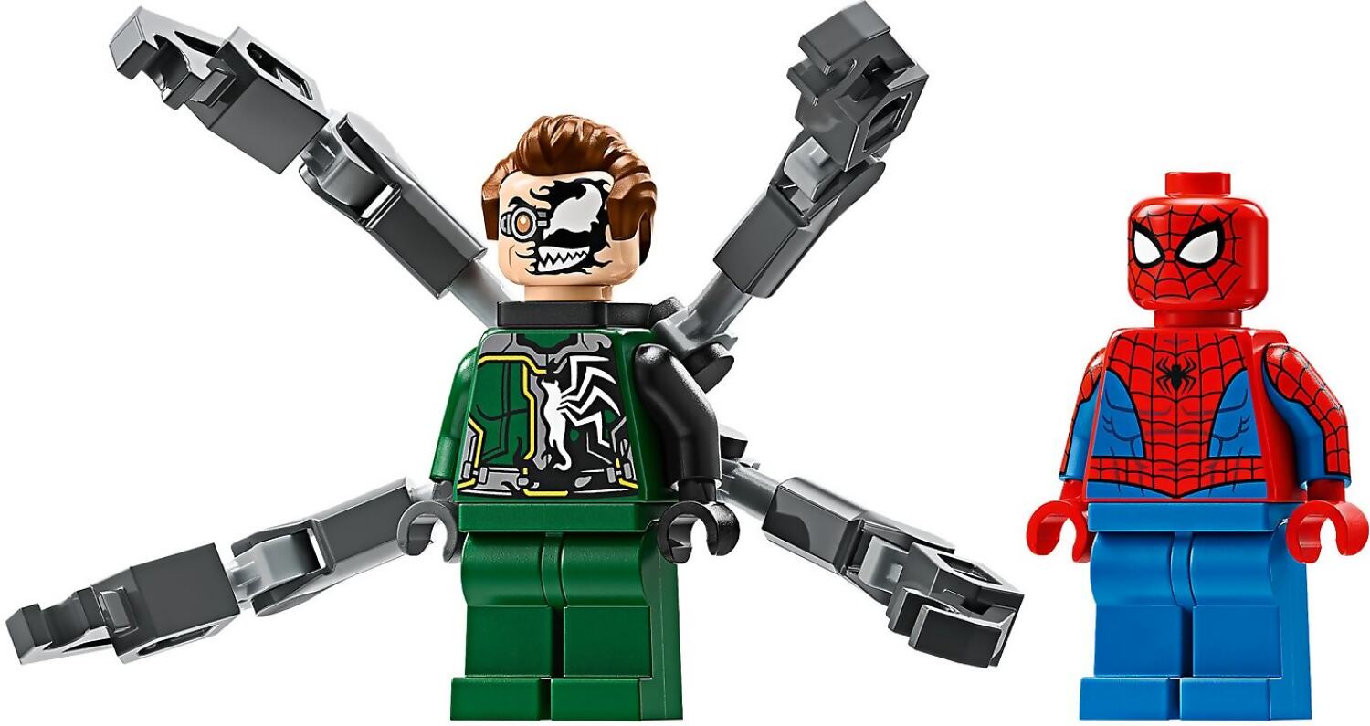 - Spider-Man vs. Doc Ock – Includes a buildable Spider-Man motorcycle with 2 stud shooters, plus 2 minifigures: Spider-Man with 2 web shooters and Doc Ock with 4 long, flexible tentacles