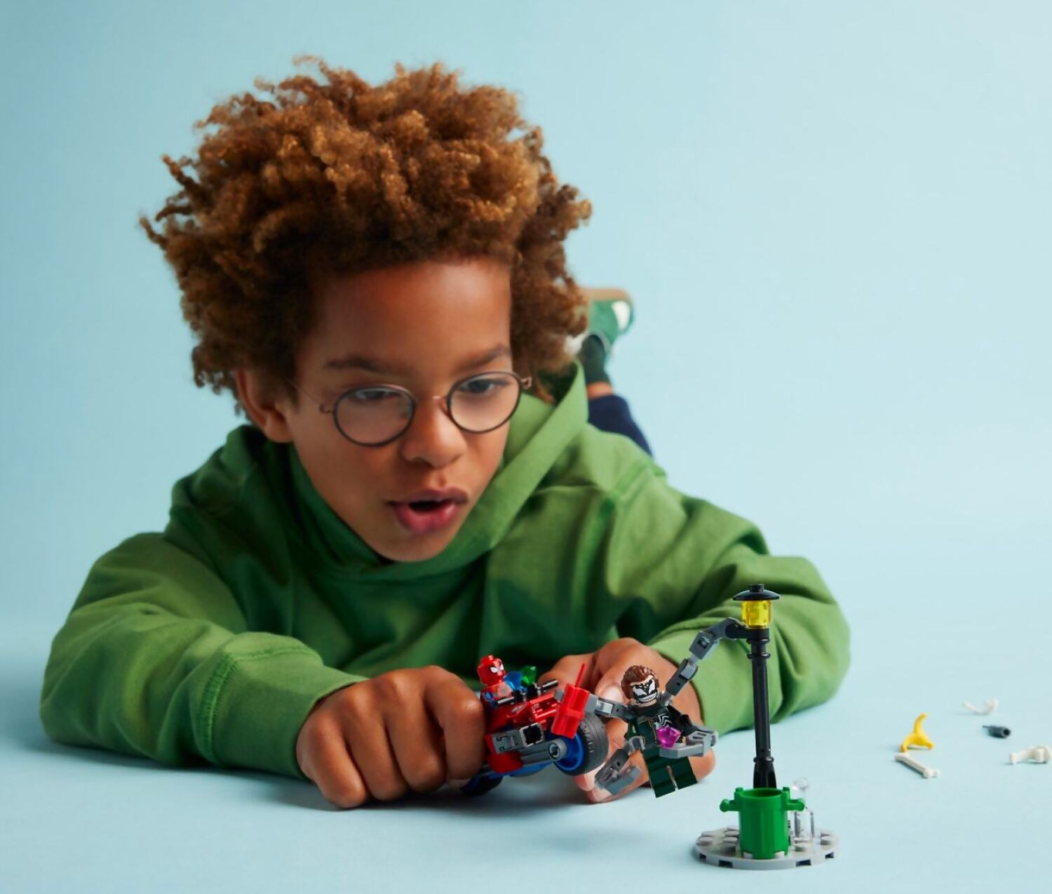 - Easy-to-build kids’ motorcycle – Spider-Man fits onto the driver’s seat of his movable bike, and Doc Ock’s arms can hold onto accessories and the streetlight