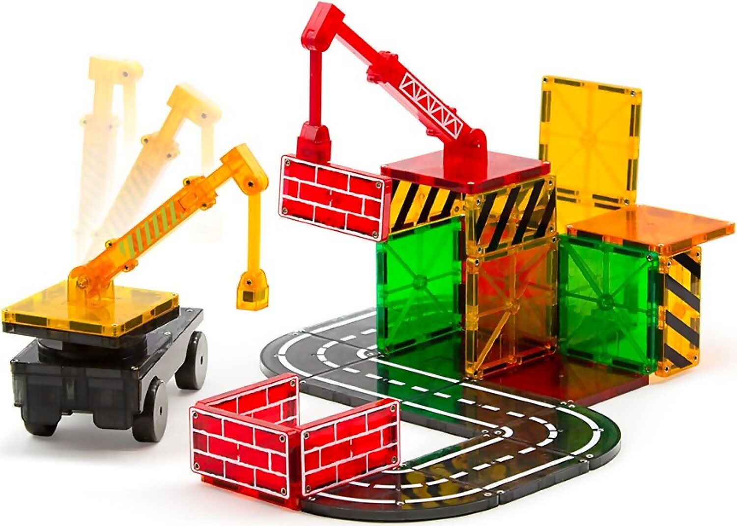 - What’s Included: 32 magnetic pieces, including 6 Road Squares, 4 Road Quarter Circles, 10 Squares, 8 Rectangles (4 Bricks, 4 Cautions), 1 Spinner, 1 Wheeled Chassis, 2 Extendable Cranes