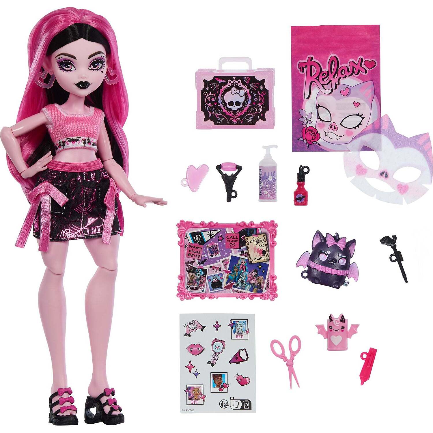 - Also included is a face cleanser, serum, and a soft sheet mask that comes out of its pouch! To make her at-home spa time even cozier, Draculaura decorates with a Count Fabulous plush.