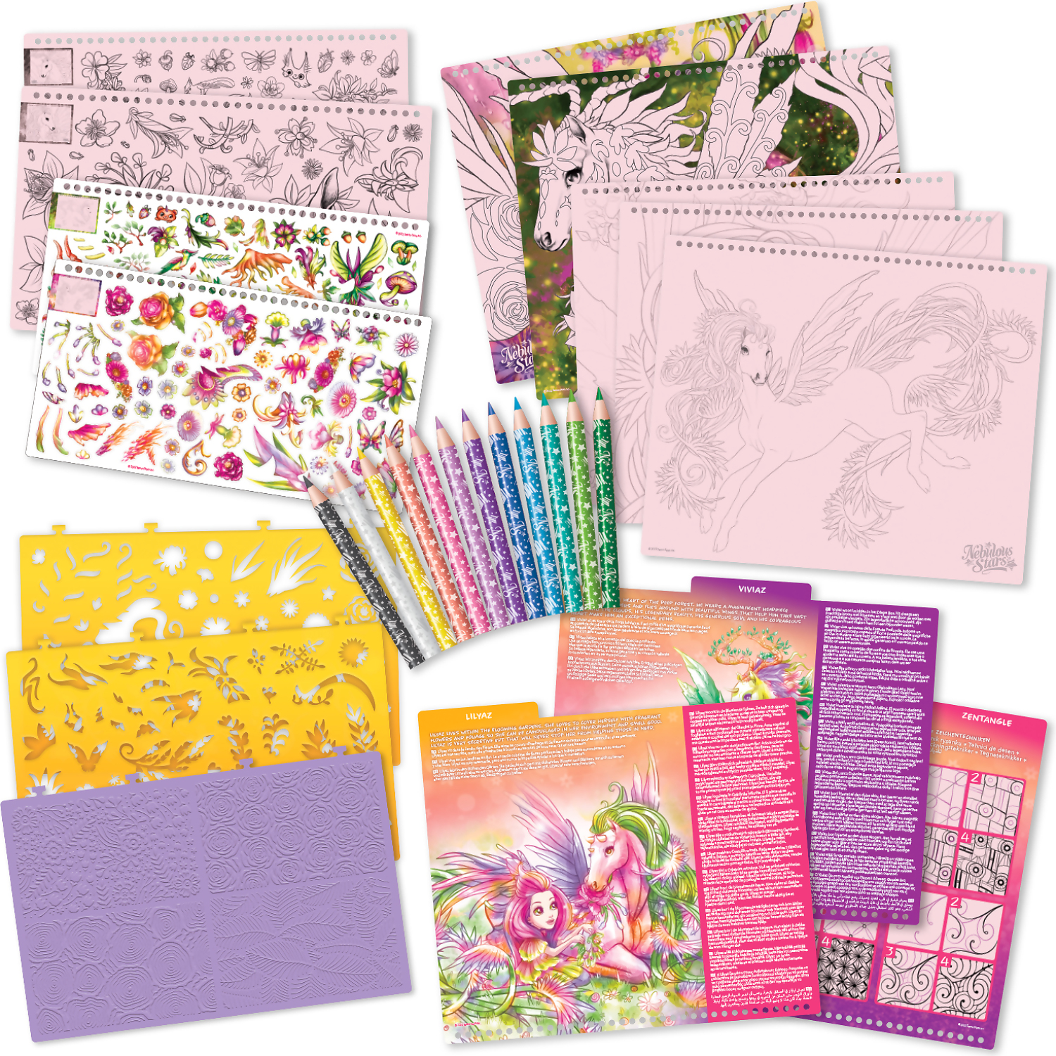 Create mystical and stunning fantasy horses worthy of flying in the magical nebula skies! Use an array of stickers, stencils and techniques to design Petulia and Hazelia’s horses.