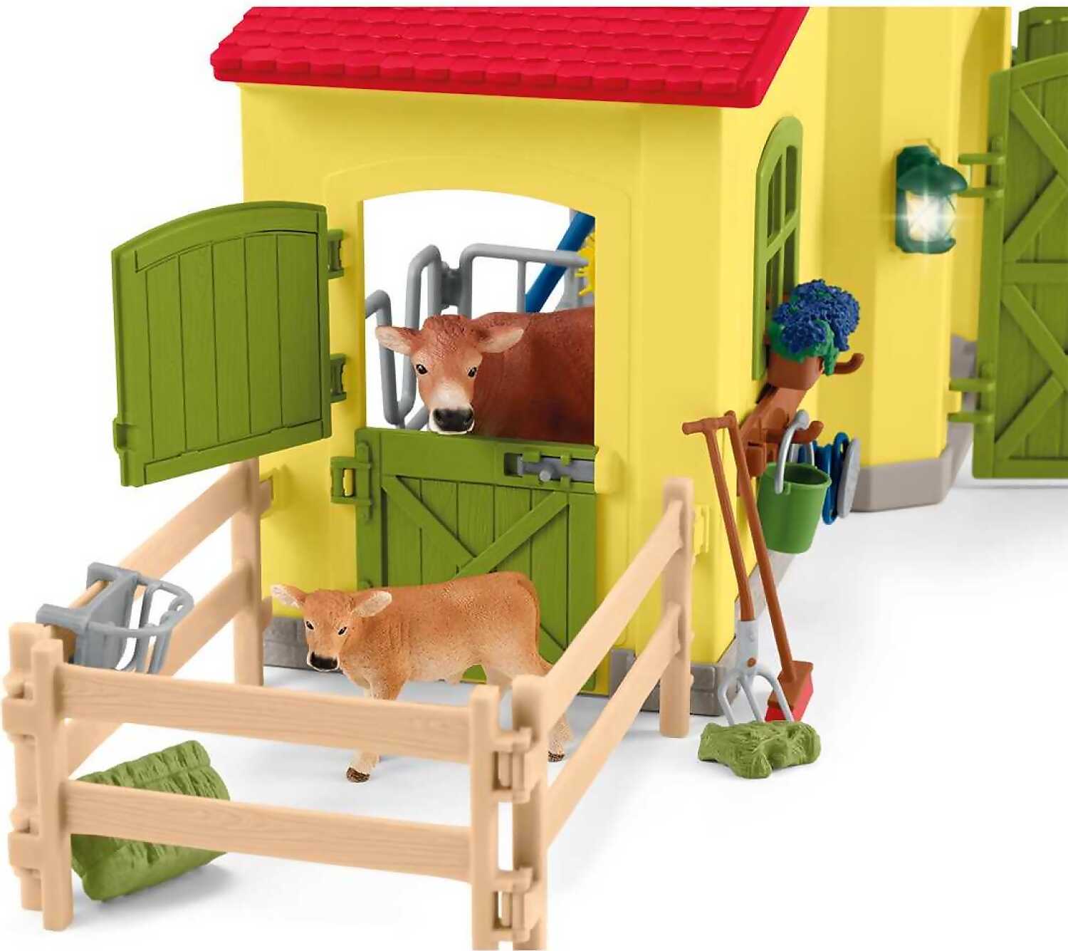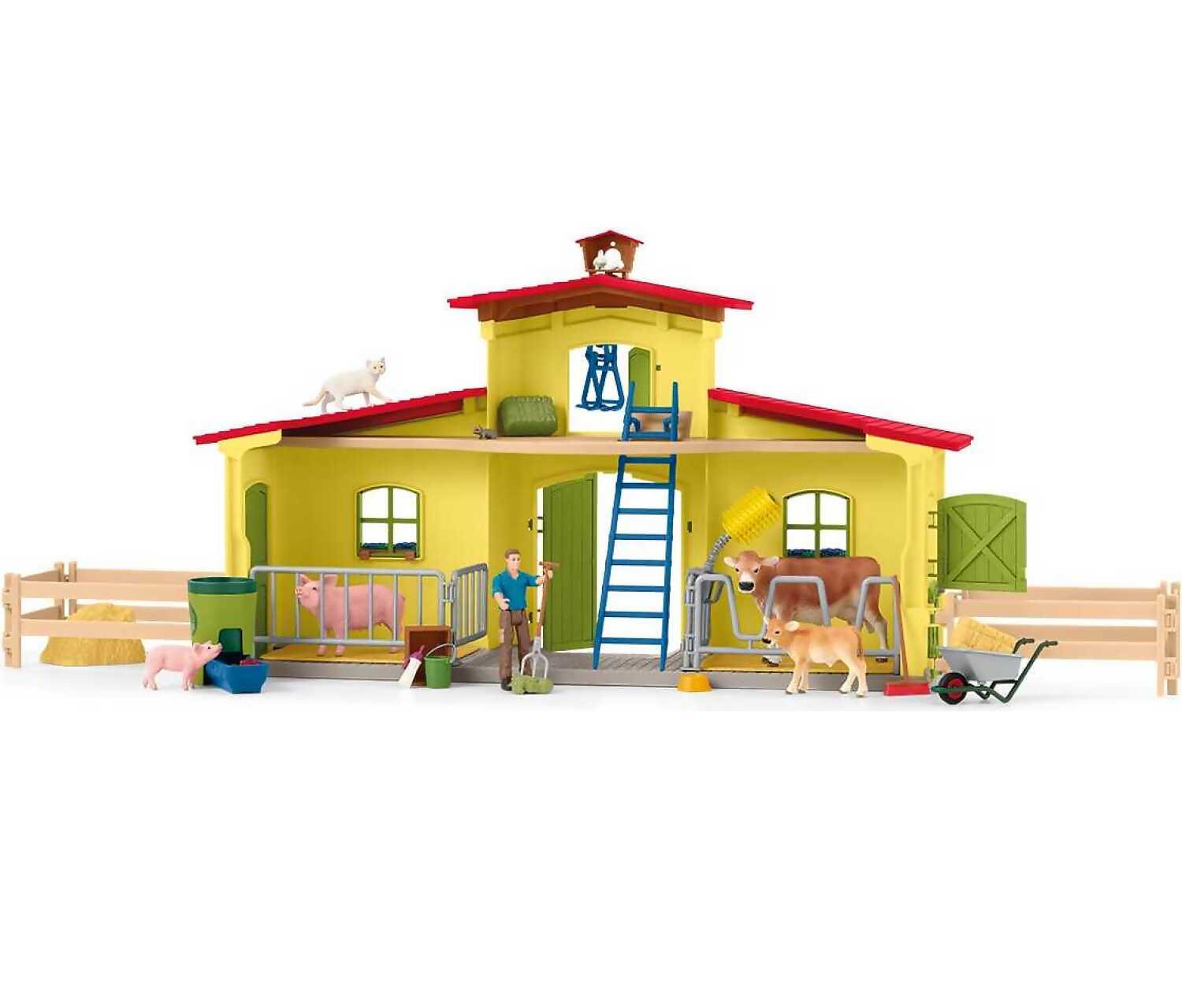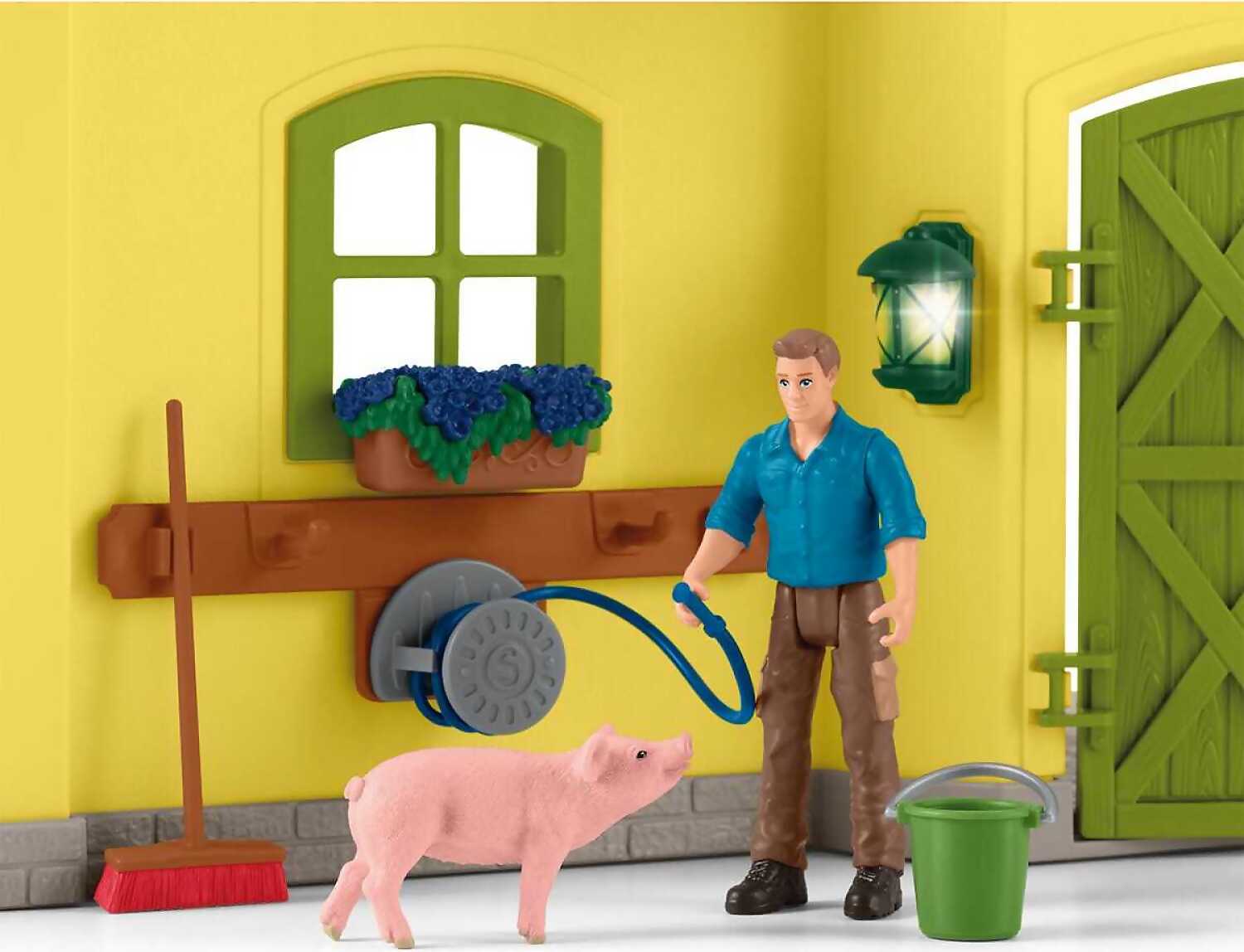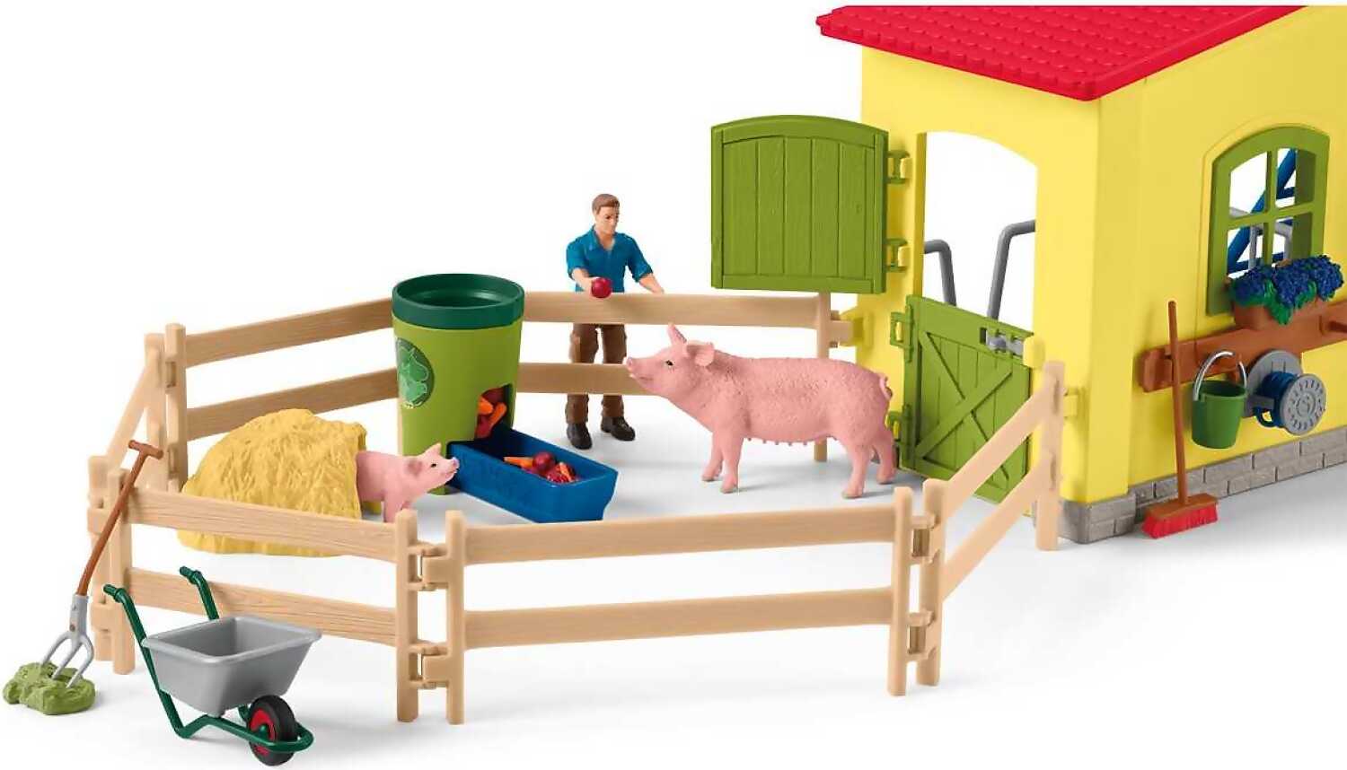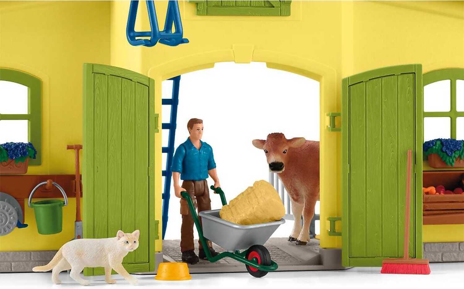 1x stable building, 1x Farmer Paul, 1x cow, 1x calf, 1x pig, 1x piglet, 1x cat, 1x dove, 1x mouse, 1x dovecote, 2x flower box, 2x straw feeder, 4x fence long, 2x fence short, 1x crane with winch, 1x fodder carousel, 1x hay hollow, 1x water hose, 1x ladder, 1x feed box, 1x rack, 1x bowl, 1x feeding bottle, 1x cow brush, 1x feeding trough, 1x pitchfork, 1x spikeable hay, 1x broom, 1x wheelbarrow, 1x bucket, 1x straw bale, 1x hay bale, 8x carrots, 6x apples, 1x eggs, 1x sticker sheet. Small parts and small balls can lead to choking.