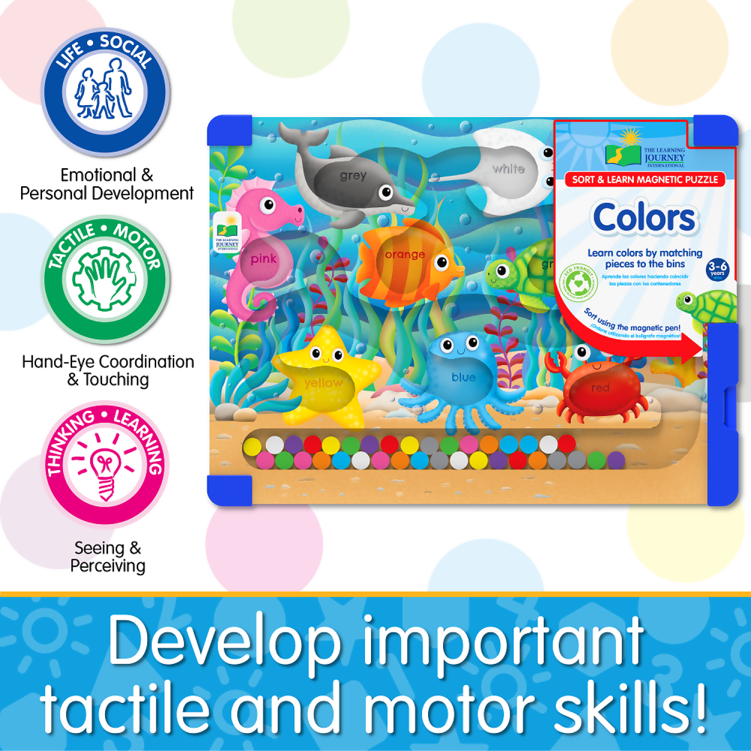 The Learning Journey – Sort & Learn Magnetic Puzzle – Colours is a vibrant sea life-themed tray puzzle designed to help children explore colour recognition through interactive play. Using the magnetic pen, little learners guide each colourful magnetic piece into its matching bin, reinforcing early sorting skills. Once the puzzle is complete, flipping it over reveals a clever release mechanism where the pieces tumble back into the collection area, ready for another round.