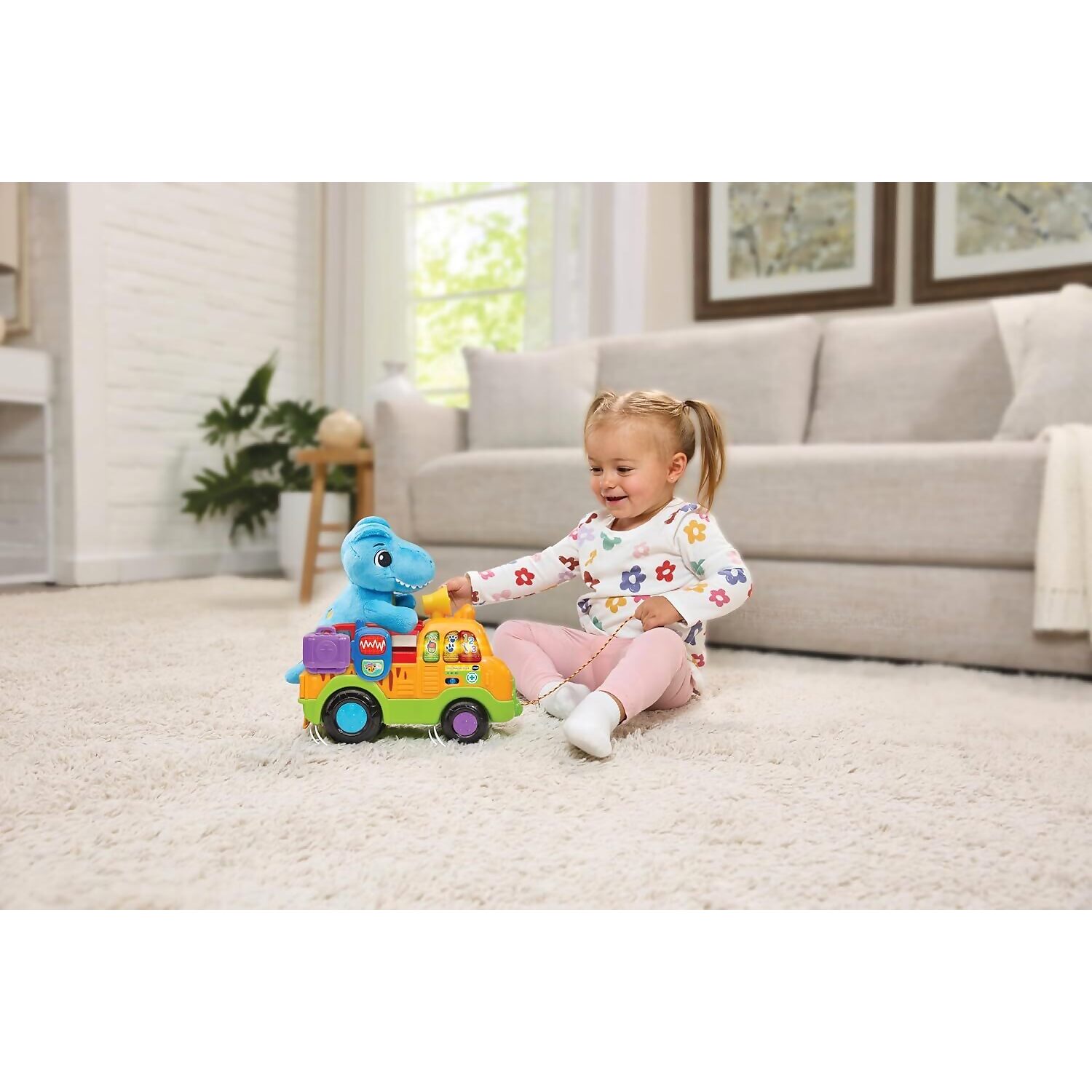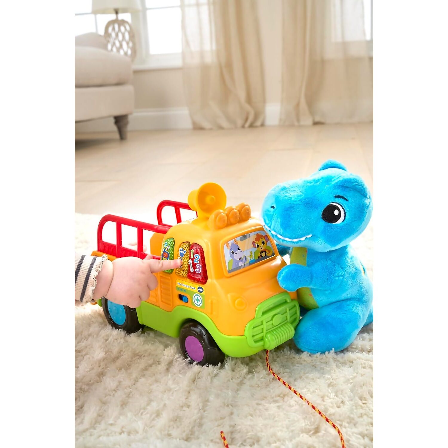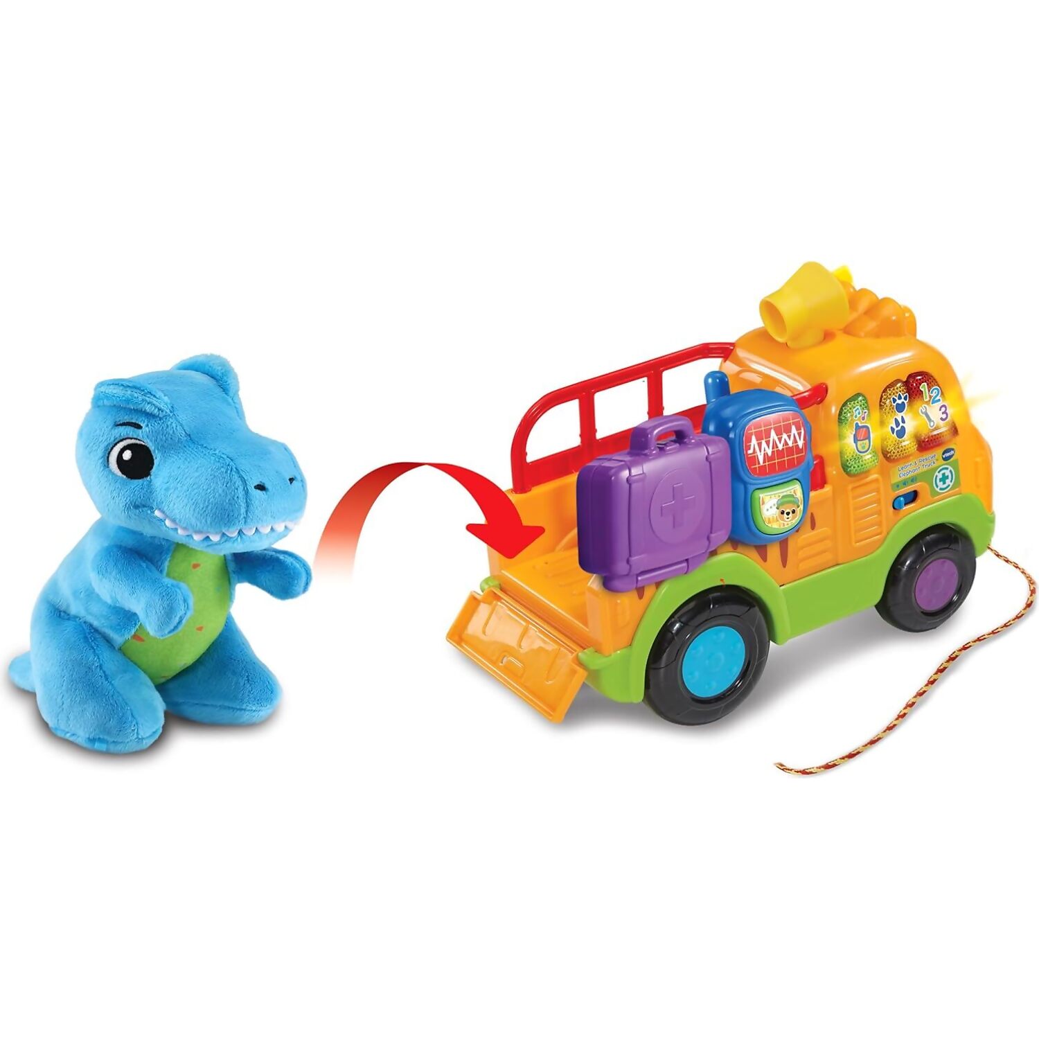 Embark on a prehistoric rescue mission with the VTech Baby Dino Rescue Truck, a pull-along toy packed with interactive features and imaginative play. Toddlers can push or pull the truck using the cord, triggering exciting sounds and phrases that encourage movement and exploration. The soft blue plush T-Rex is ready to be rescued and cared for, adding a nurturing role-play element to the adventure.