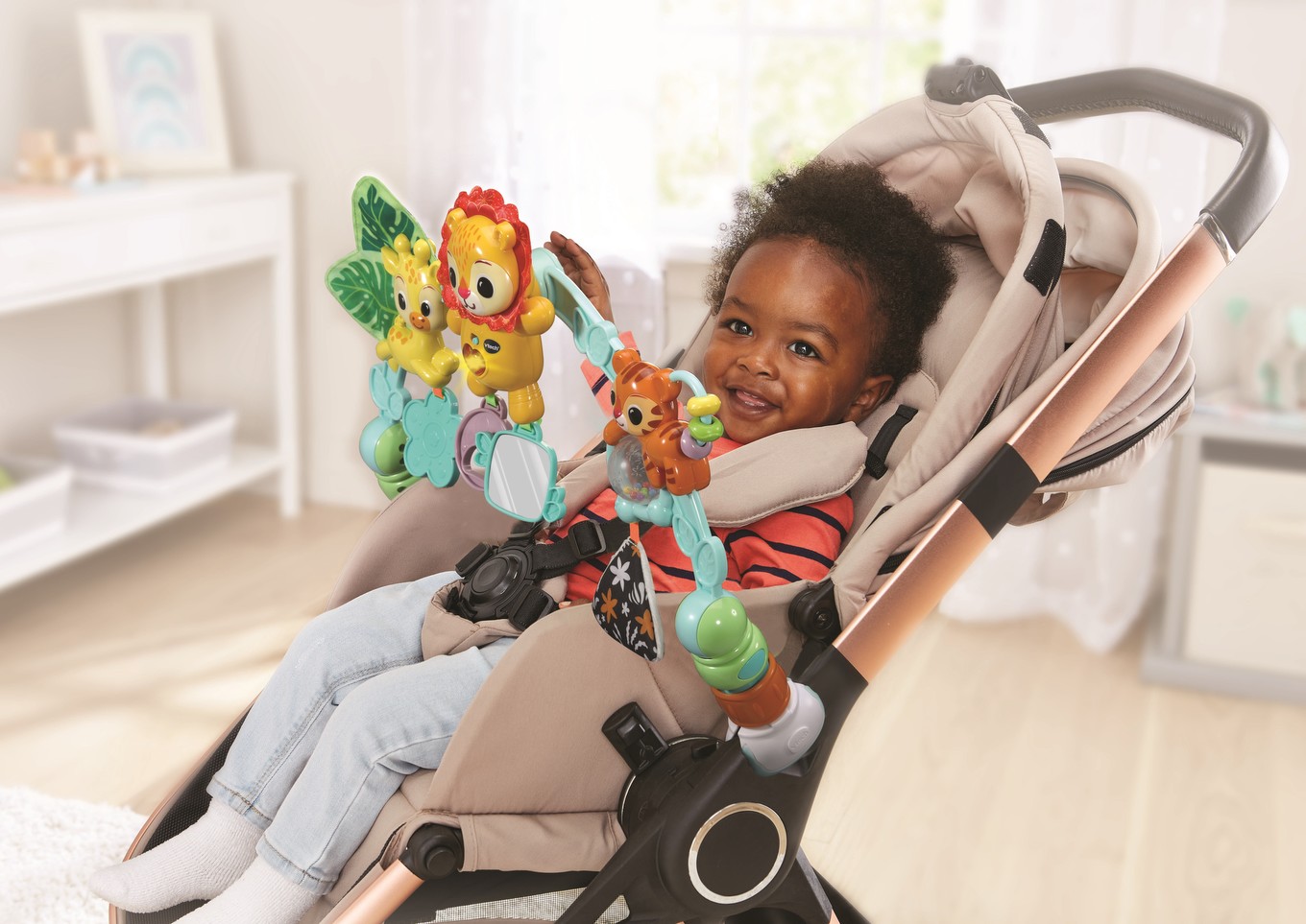 Description: The VTech On-The-Go Animal Arch is a cute and playful activity arch for children aged 3 to 24 months. With 3 fun safari characters to play with, this toy offers endless possibilities for play. The twisting beads, crinkly and textured materials provide visual and tactile stimulation. The lion’s self-discovery mirror and circle ring trigger fun responses to encourage continuous play. The universal clamps allow the arch to be easily attached to different prams.